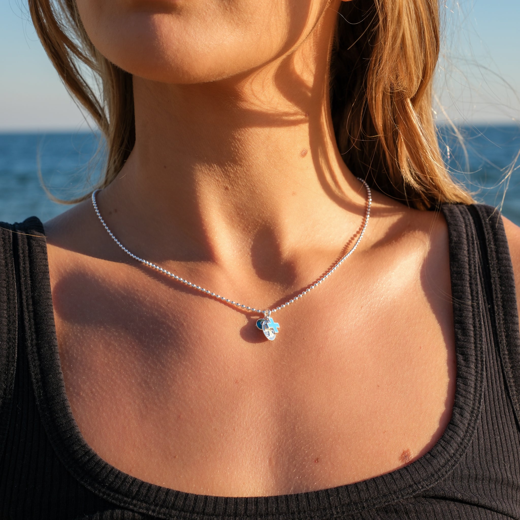 The Mini Faith necklace features a sterling silver ball chain with a coloured enamel cross and matching evil eye charm.