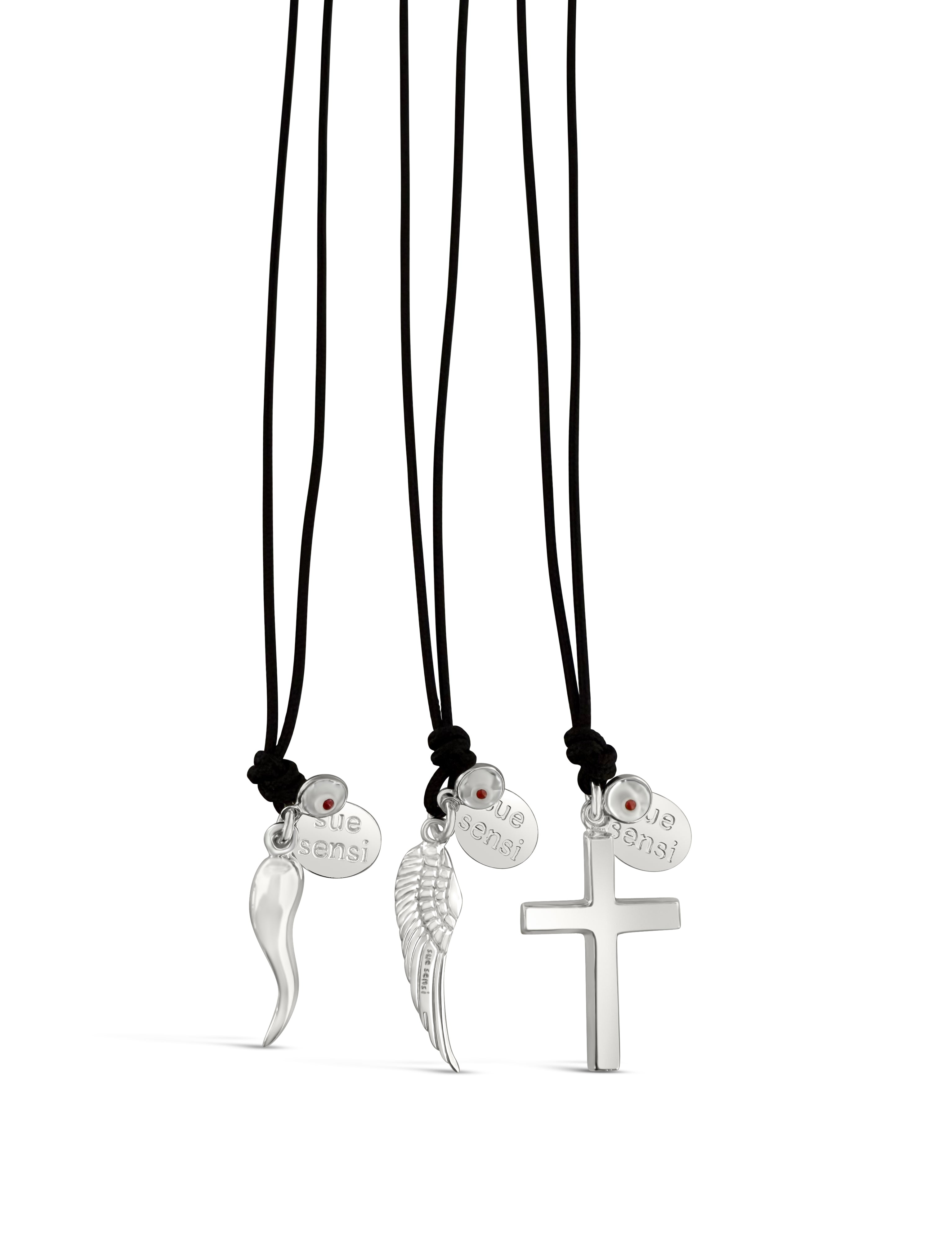 Accessorise with a Modern Edge necklace This adjustable cord necklace features a choice of a cross, chilli or wing charm that adds a touch of individuality. Plus, with a clear evil eye charm you'll be stylish and protected.