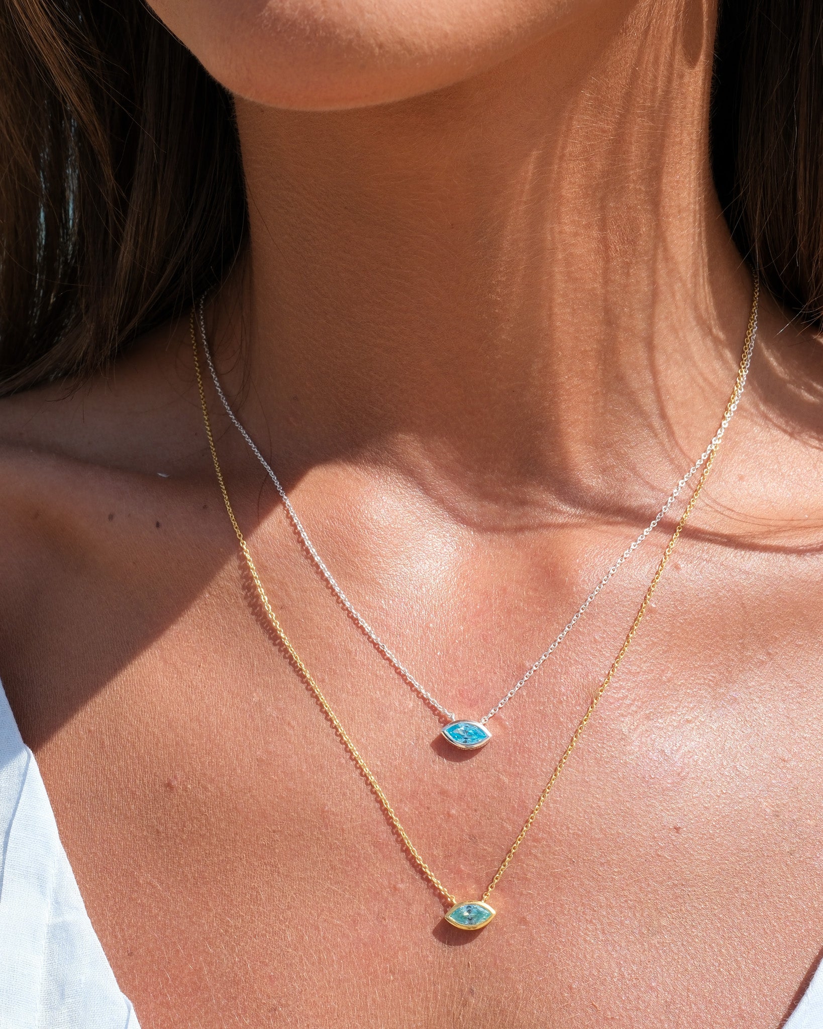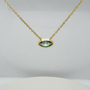 A stunning aqua CZ eye-shaped necklace designed to deflect negative energy and protect the wearer with its captivating gaze. This piece merges ancient symbolism with contemporary elegance, offering both a beautiful adornment and a powerful shield. Pair with the matching ring.