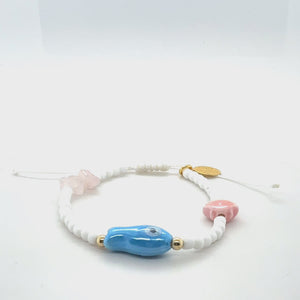 This bracelet is a beautiful talisman of graceful fortune, open love, and inner peace, making it the perfect piece to wear every day.The fish is for fortune, the rose quartz is for unconditional love and the shell is regain emotional balance.