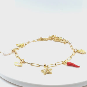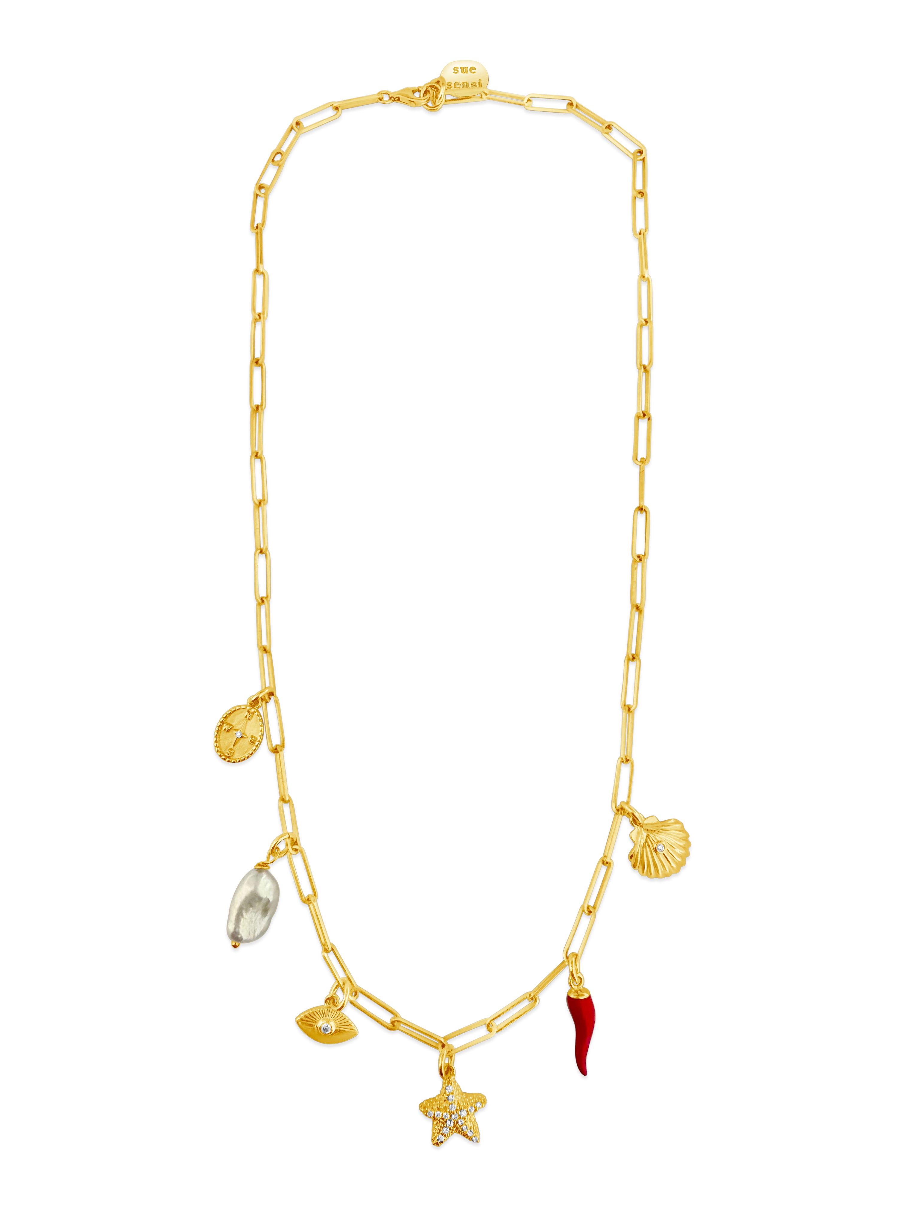 Wearing a variety of charms creates a story of protection and resilience, with the pearl symbolizing wisdom, the eye for warding off harm, the starfish for strength, the chilli for protection, the Compass Charm for guidance, and the Seashell for safety, all attached on a paperclip chain.