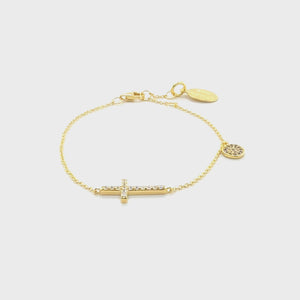 Our stunning CZ cross bracelet beautifully combines faith and protection, featuring a radiant cross to symbolize devotion and an embedded eye to ward off negativity. Pair with a matching necklace.