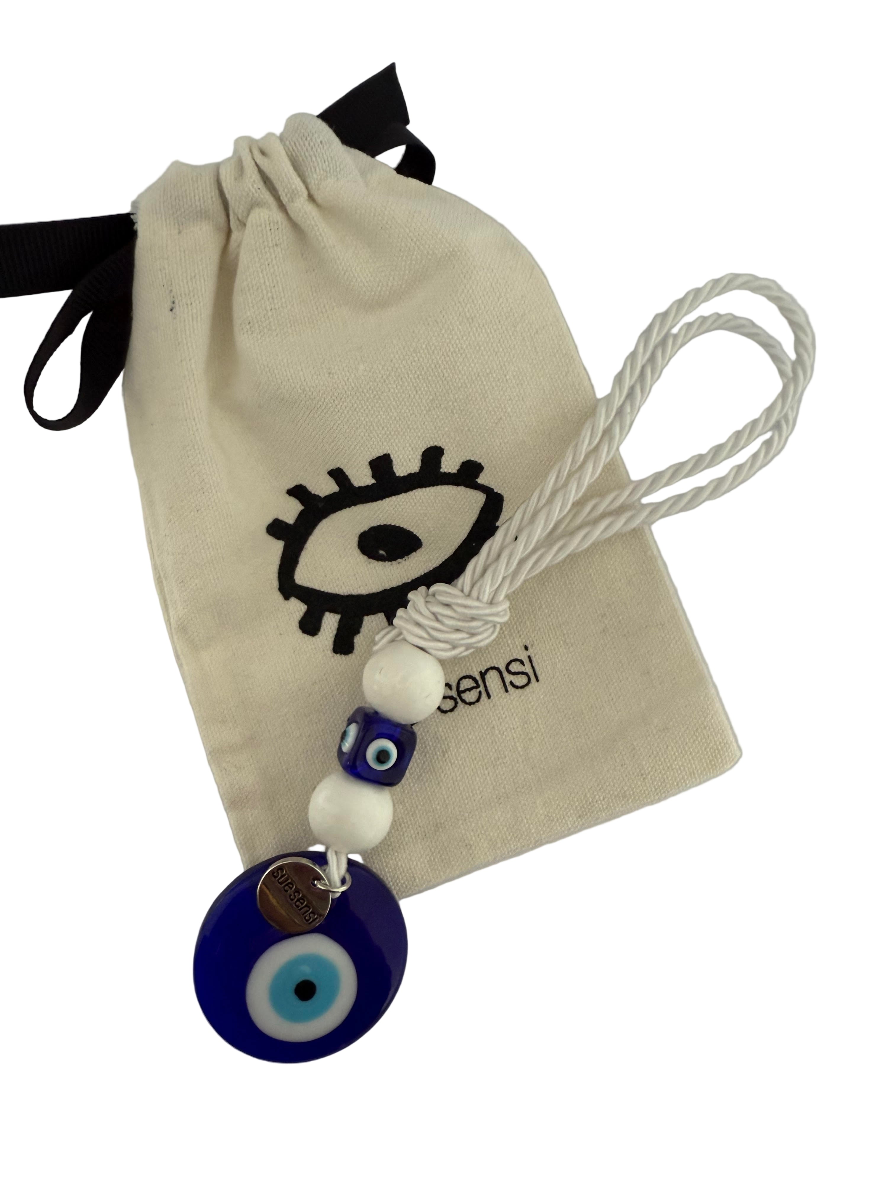 Bring luck and safeguarding energy into your space with the Guard Us Home Charm , a blue glass Evil Eye hangs on a contrasting white rope cord, creating a powerful talisman. The perfect piece for stylish, effortless protection anywhere in your home.