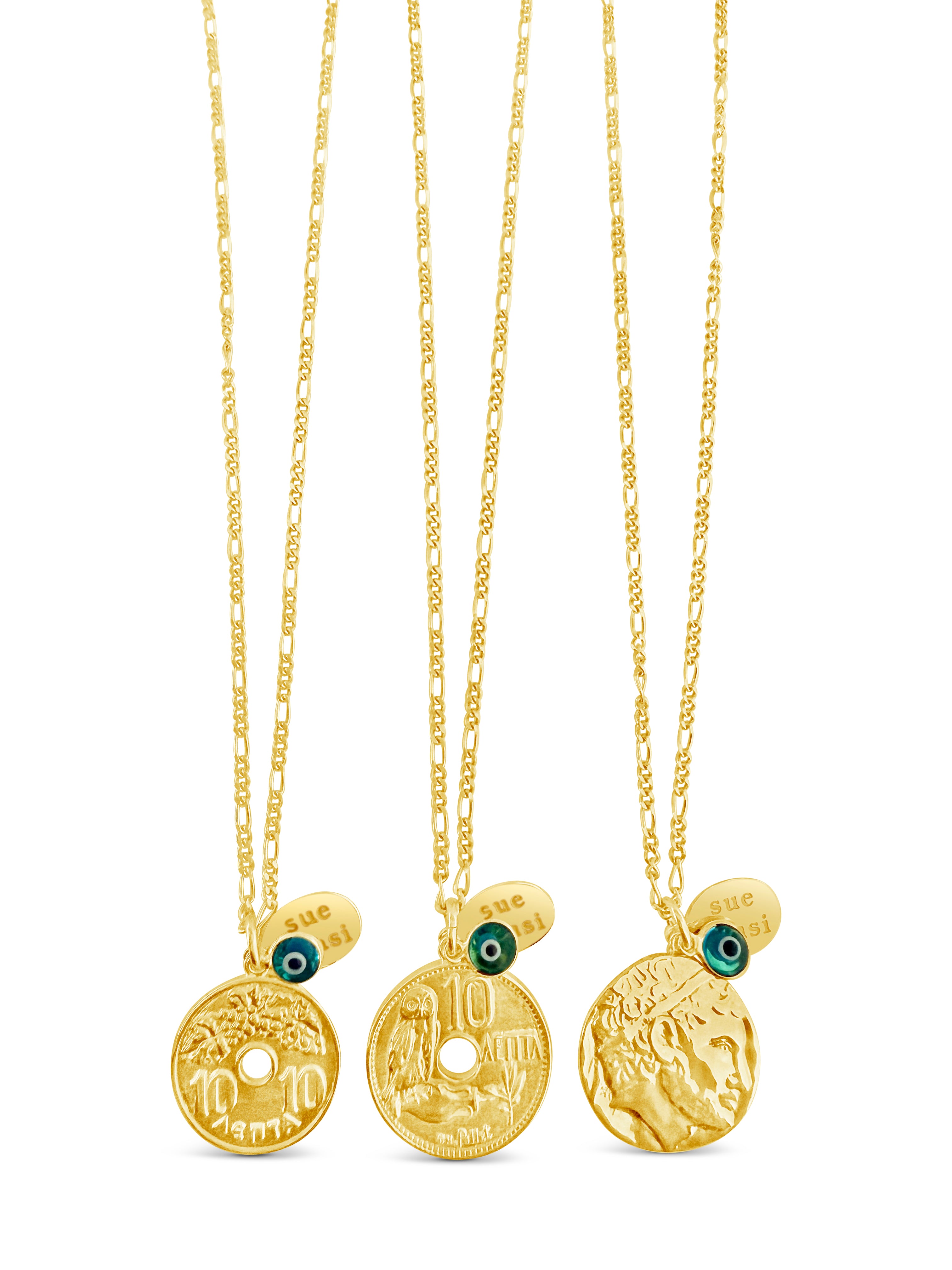 Add a vibe of luck and protection with our Greek Lucky Coin Necklace. Crafted from 925 sterling silver, it features a Greek coin pendant, a blue evil eye charm, and our signature Sue Sensi tag.