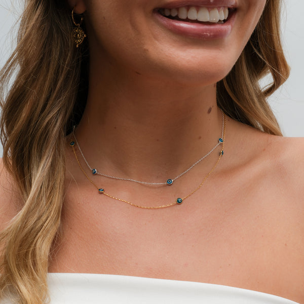 The Radiant Protection necklace is made from solid sterling silver and features multiple dainty evil eyes for maximum protection and a playful twist. It is available in a gold plated option and has a matching Radiant Protection bracelet to complete the look.