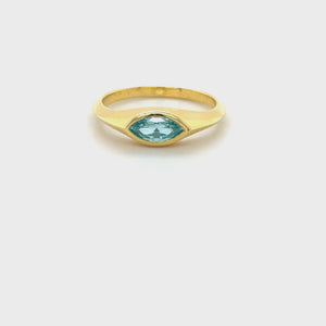 A stunning aqua gaze is CZ eye-shaped ring designed to deflect negative energy and protect the wearer with its captivating gaze. This piece merges ancient symbolism with contemporary elegance, offering both a beautiful adornment and a powerful shield. Pair with the matching necklace.
