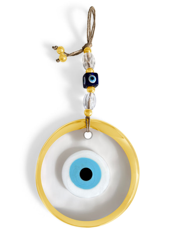 This guardian home charm features a striking 12cm glass evil eye, designed to perpetually watch over your space. Hung on a sturdy rope cord and accented with an additional evil eye bead, it actively wards off negative energy, ensuring your home always remains protected and filled with good luck.