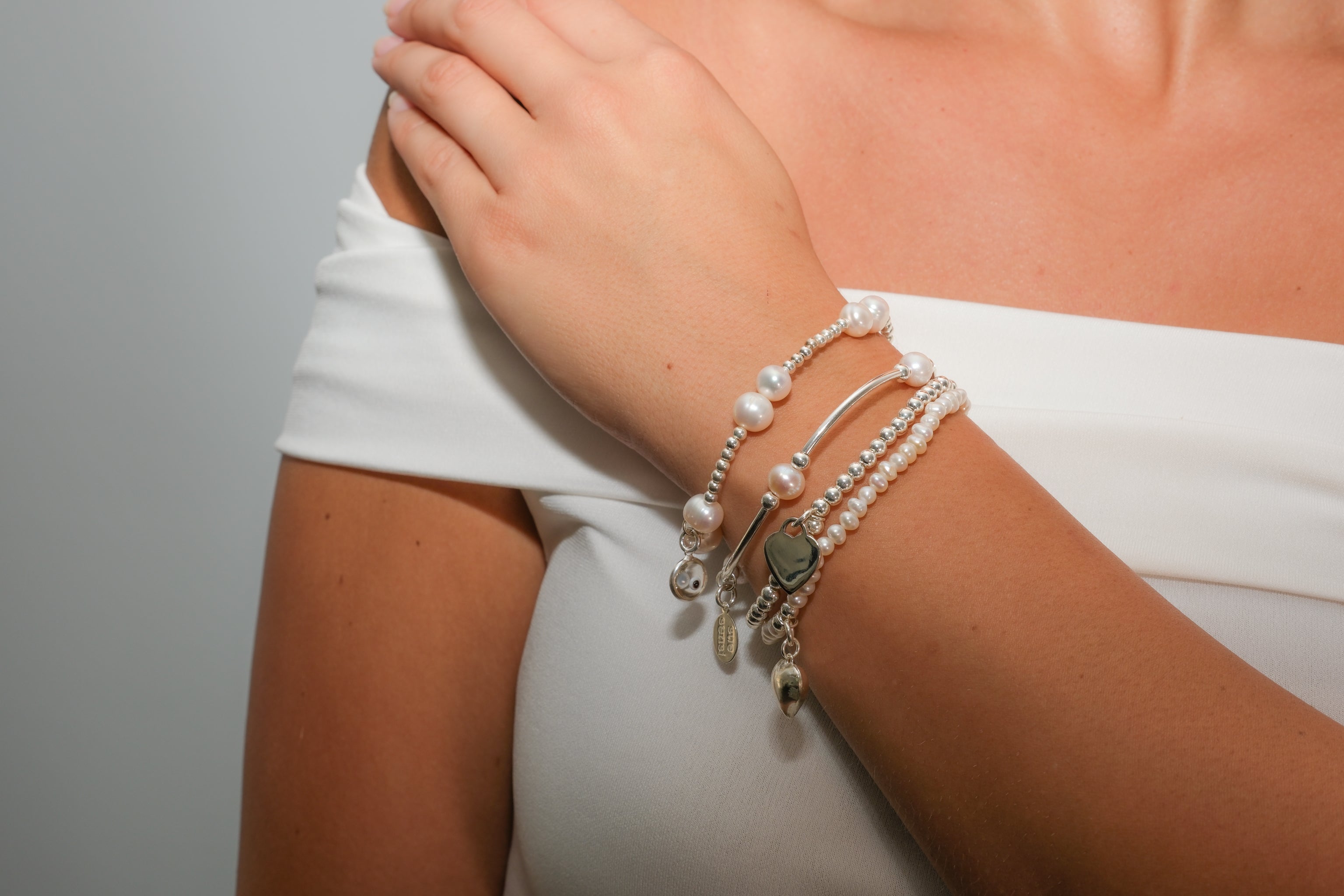 The I am with you set features a mix of 925 sterling silver and fresh water pearl beaded bracelets. It is adorned with a flat heart, puffy heart and evil eye charm for love and protection.