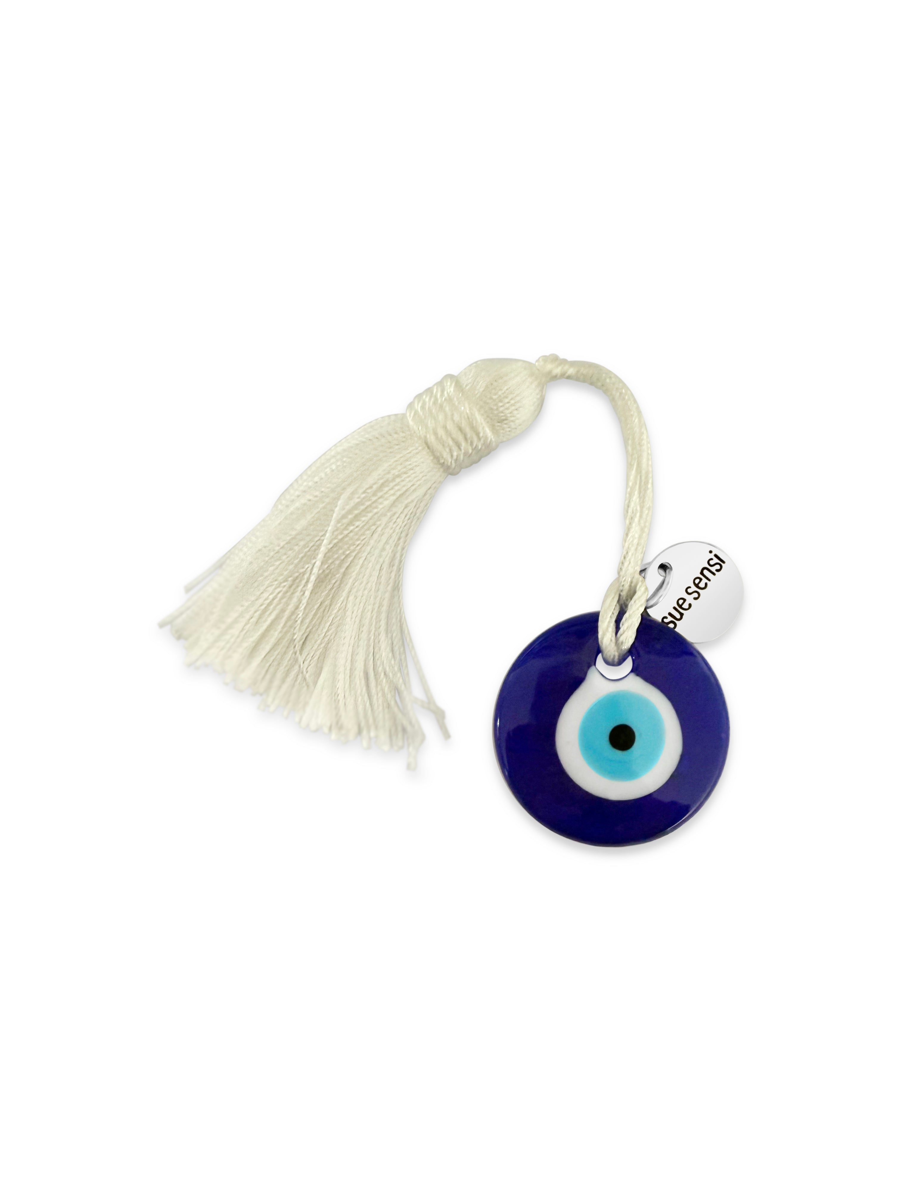 A beautiful symbol of protection and luck, this evil eye charm with its charming handmade small tassel is ready to hang anywhere. It's an ideal and heartfelt favour for weddings, Christenings or any moment deserving of a special touch.